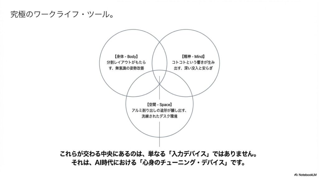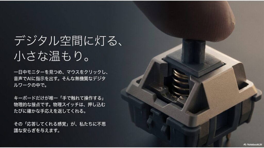 そんな無機質なデジタルワークの中で、キーボードだけが唯一「手で触れて操作する」物理的な接点でありつづけています。