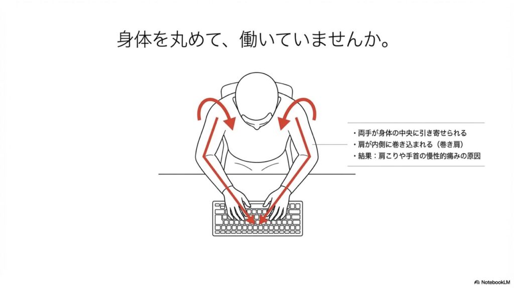 一般的なキーボードで長時間タイピングすると、両手が身体の中央に引き寄せられ、肩が内側に巻き込まれた姿勢が続きます。