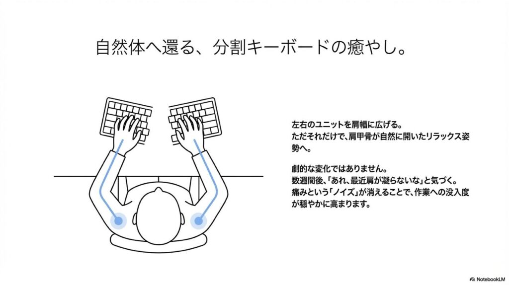 分割キーボードは、左右のユニットを肩幅に広げて使えます。肩甲骨が自然に開いたリラックス姿勢を維持できるようになります。