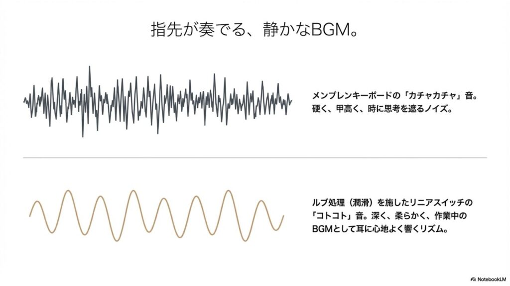 底打ちの硬い安いメンブレンキーボードの「カチャカチャ」と、ルブ処理を施したリニアスイッチの「コトコト」では、まるで印象が違います。