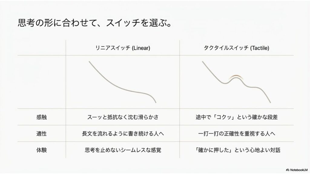 リニアスイッチは、押し始めから底まで滑らかに沈む感触。スーッと抵抗なく打てる感覚で、長文を多く書く人に好まれます。