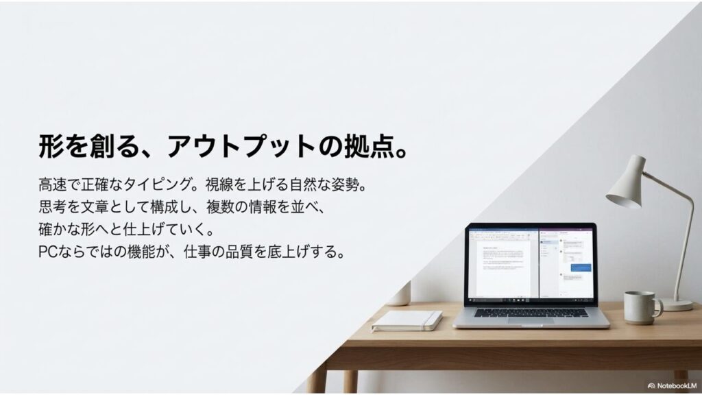 一方で、アイデアを文章として構成し、資料に仕上げ、メールに返信する「アウトプット作業」は、ノートPCの前に座ったほうが圧倒的に快適です。