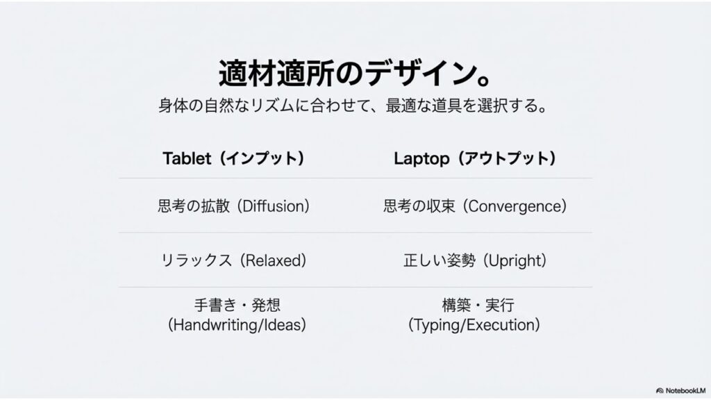 「タブレットを閉じて、PCの前に座る」。この場所の移動と道具の持ち替えが、脳にとってはモードチェンジの合図になります。インプットからアウトプットへ。