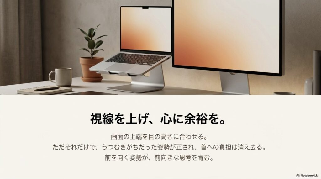 ノートPCに外部モニターを繋いだり、PCスタンドで画面の高さを上げるだけで、視線は自然と前を向きます。