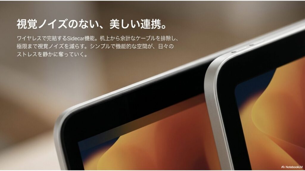iPadをMacのサブディスプレイとして使うSidecar機能を活用すれば、iPad-Mac間の接続はワイヤレスで完結します。