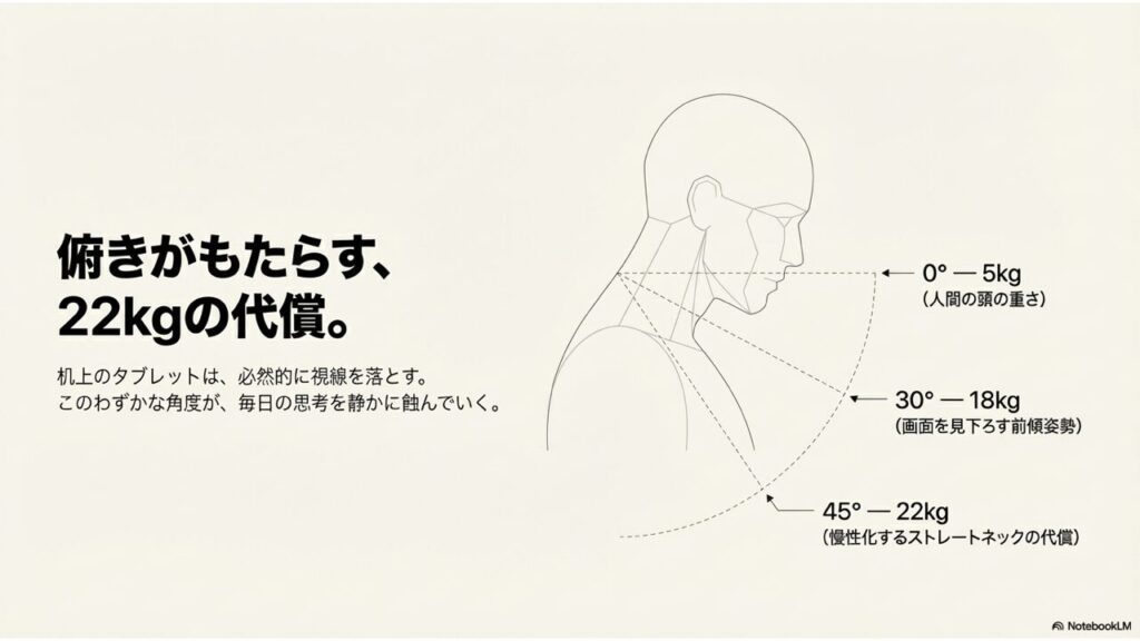 しかしタブレットは、どうしても「見下ろす」姿勢になりがちです。1日2日では問題なくても、毎日続けば肩や首のだるさは慢性化していきます。