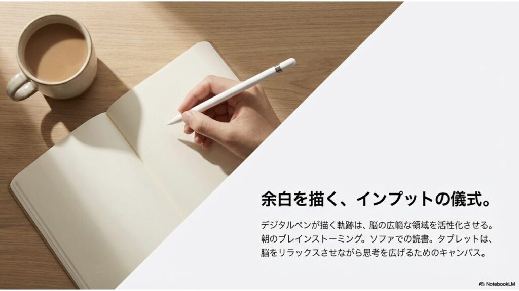 タブレットには、タブレットにしかない心地よさがあります。手書きの温もり、リラックスした姿勢でのインプット、ソファに寄りかかりながらの読書。