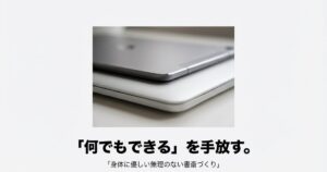 「タブレットを閉じて、PCの前に座る」。この場所の移動と道具の持ち替えが、脳にとってはモードチェンジの合図になります。インプットからアウトプットへ。