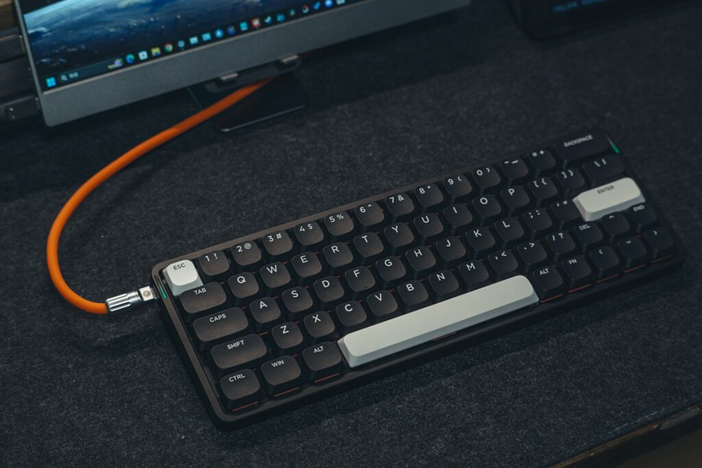 僕のデスク周りは黒色が多いので、差し色としてオレンジを選んだらピッタリでした。先ほど紹介したEPOMAKER Mixと違って、側面にUSBポートがあるキーボードと相性が良いです。
